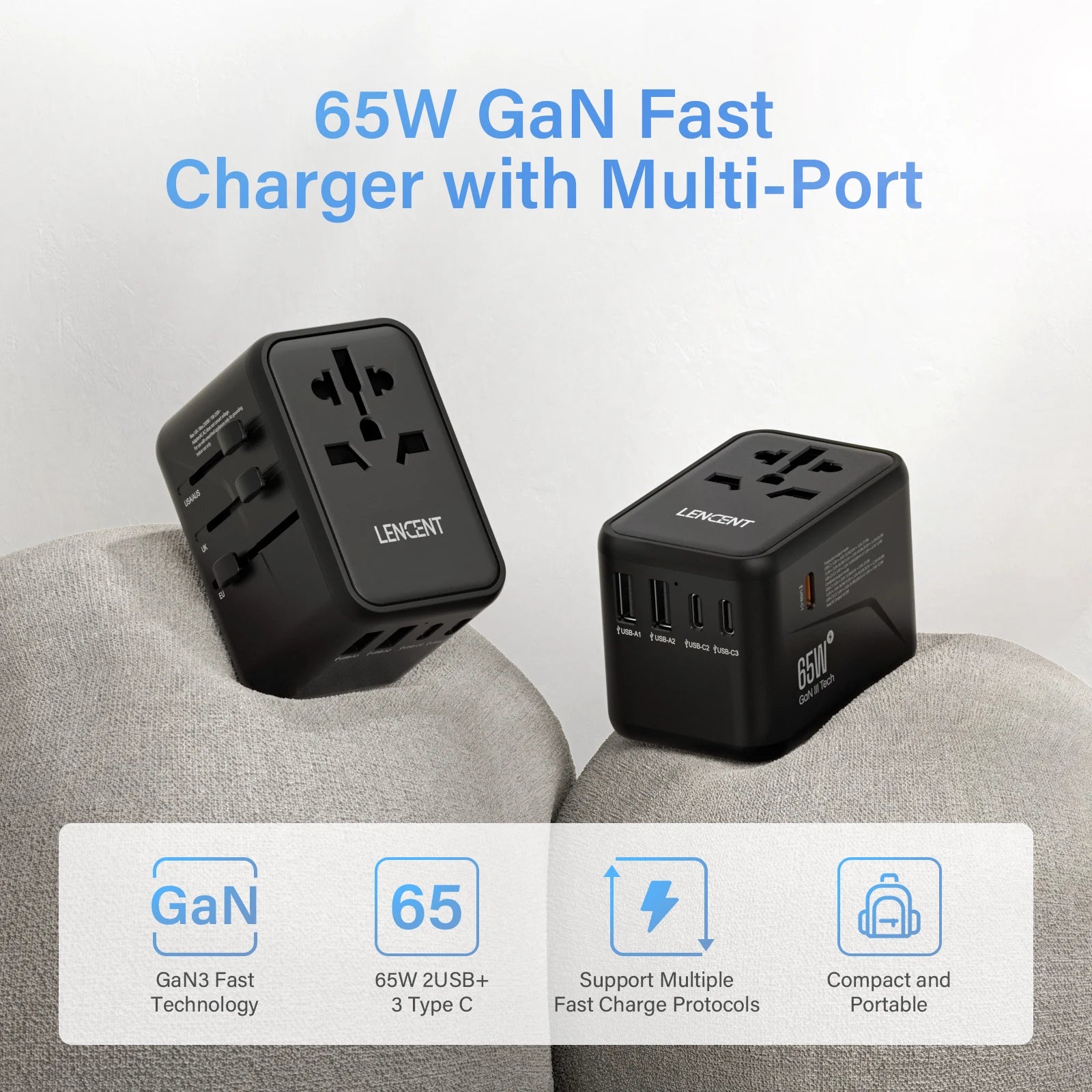 LENCENT 65W/100W GaN International Travel Adapter with 2USB 3 Type C GaN Fast Charging Adapter with EU AU US UK Plug for Travel