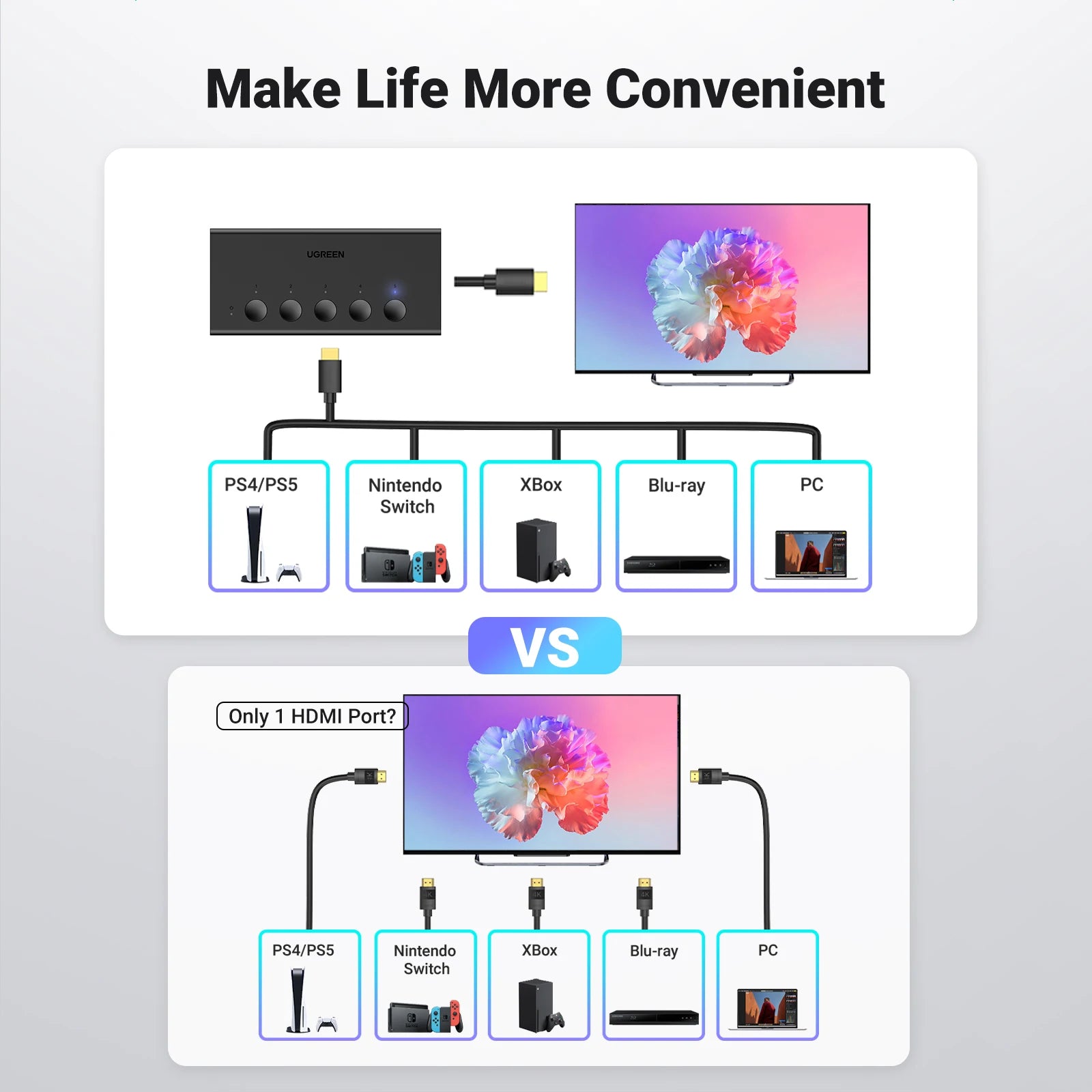 Made for Multi Game Consoles. This HDMI Switch can connect 5 source devices to 1 display without plugging and unplugging.